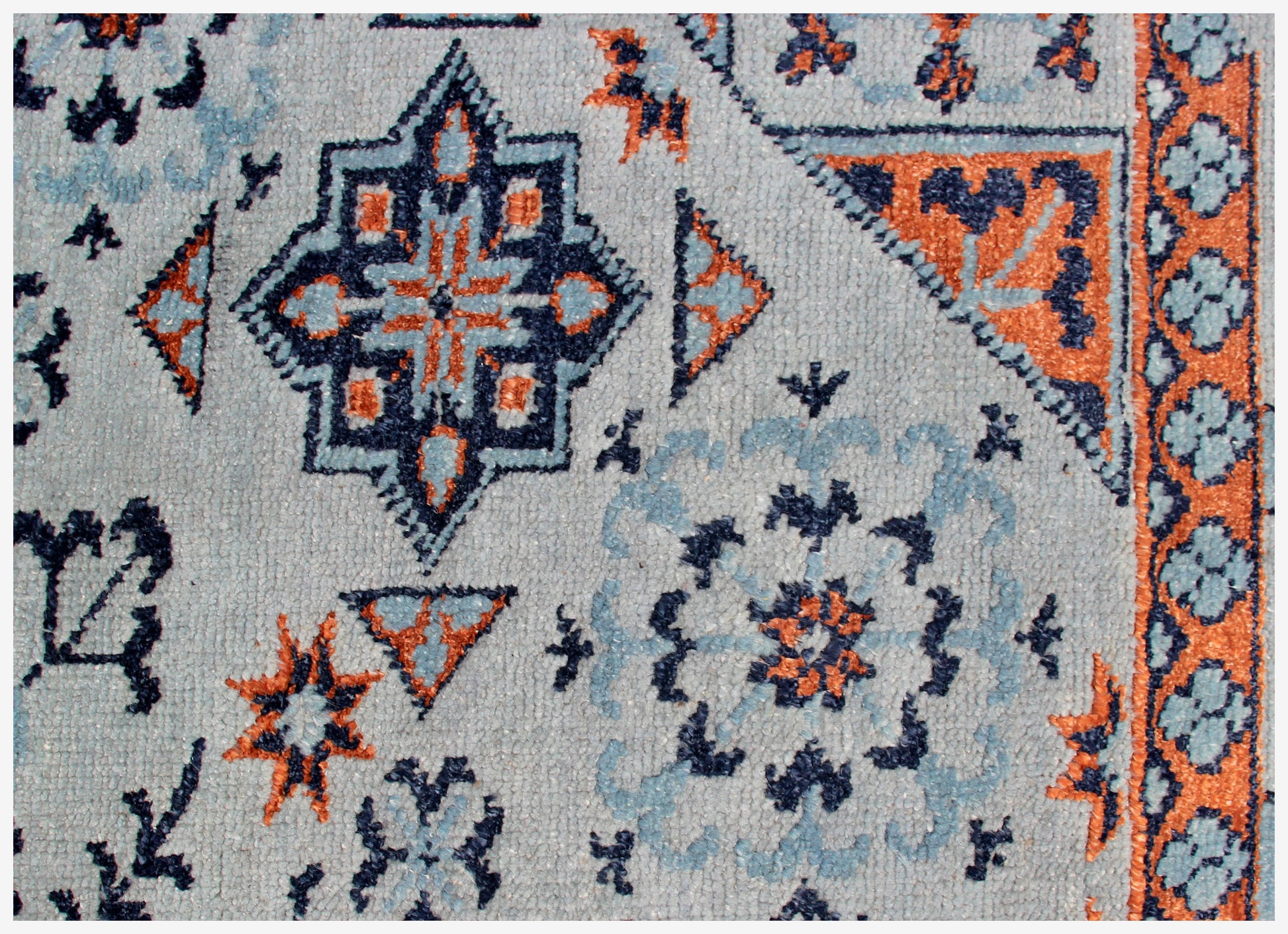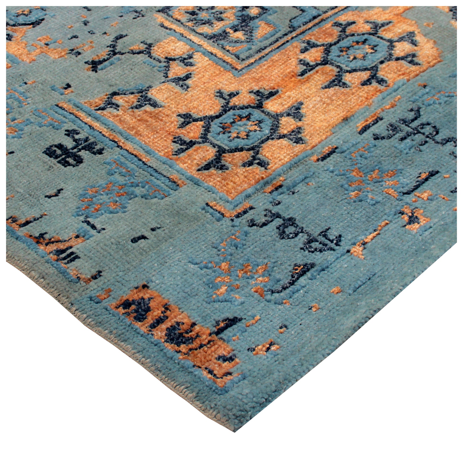 Light Blue Orange Navy 7.6x10 Hand Knotted Persian Wool Viscose Area Rug - Vintage Antique Geometric Medallion