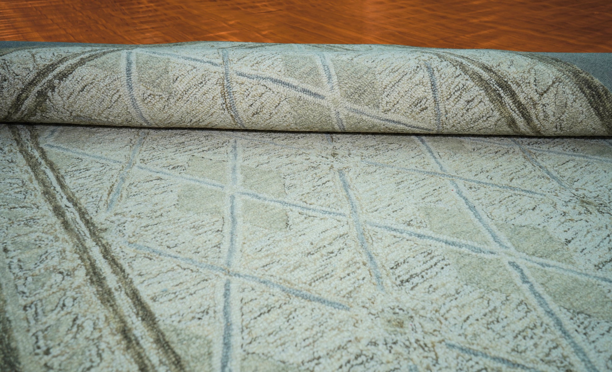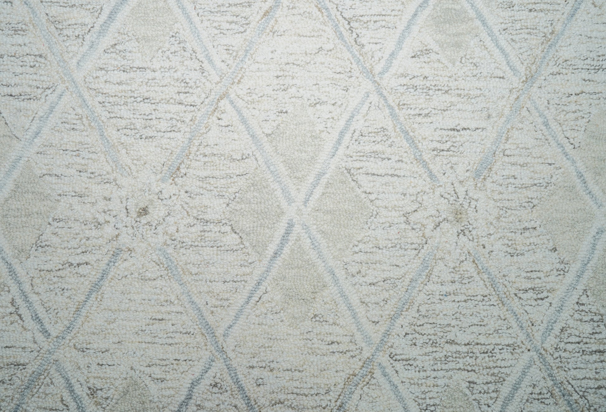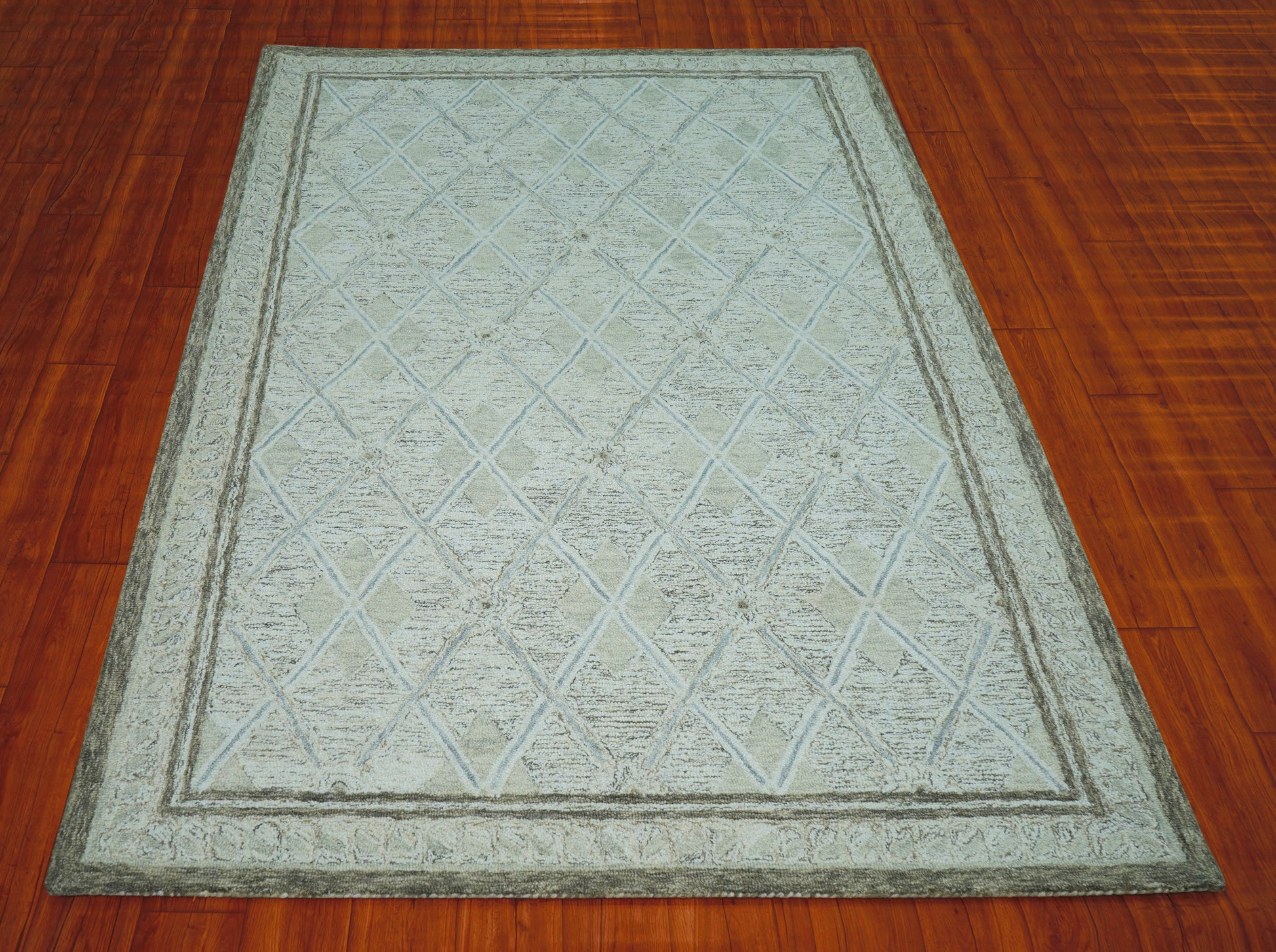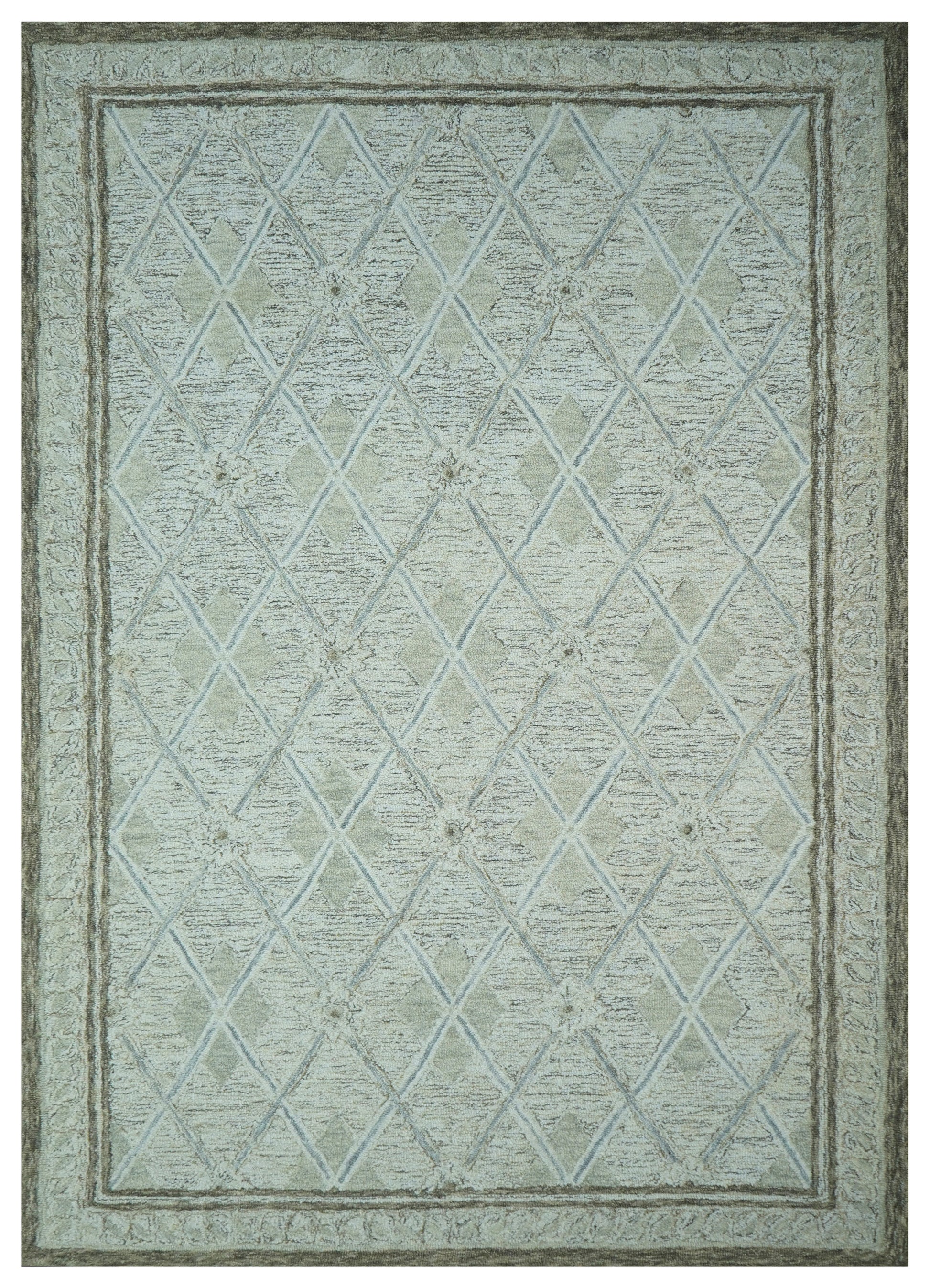 Sage Green Ivory Diamond Trellis Hand Tufted Wool Area Rug - Cut Pile Geometric Custom Sizes