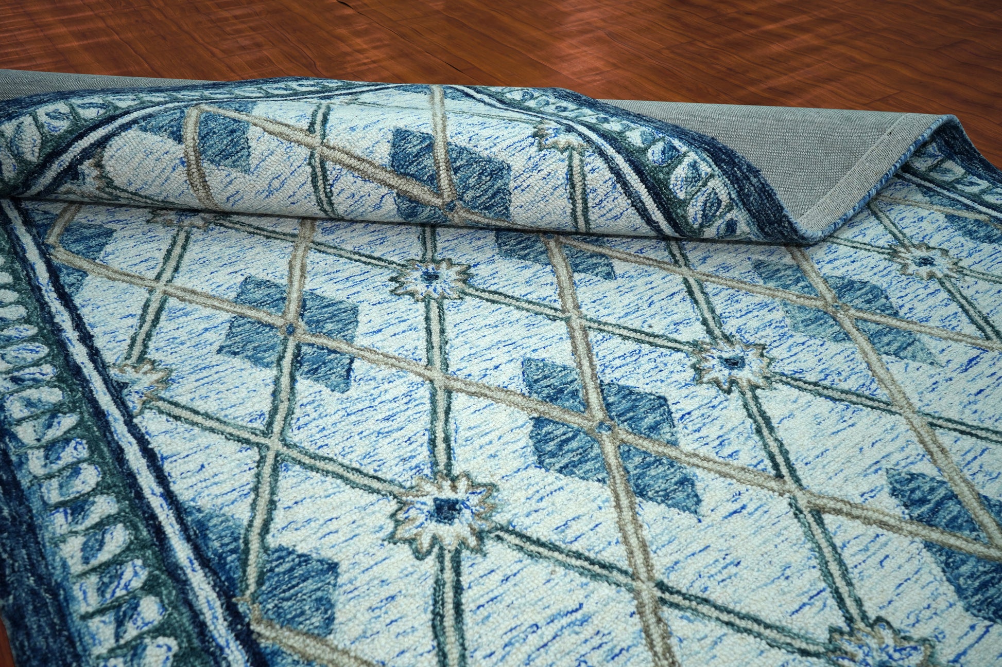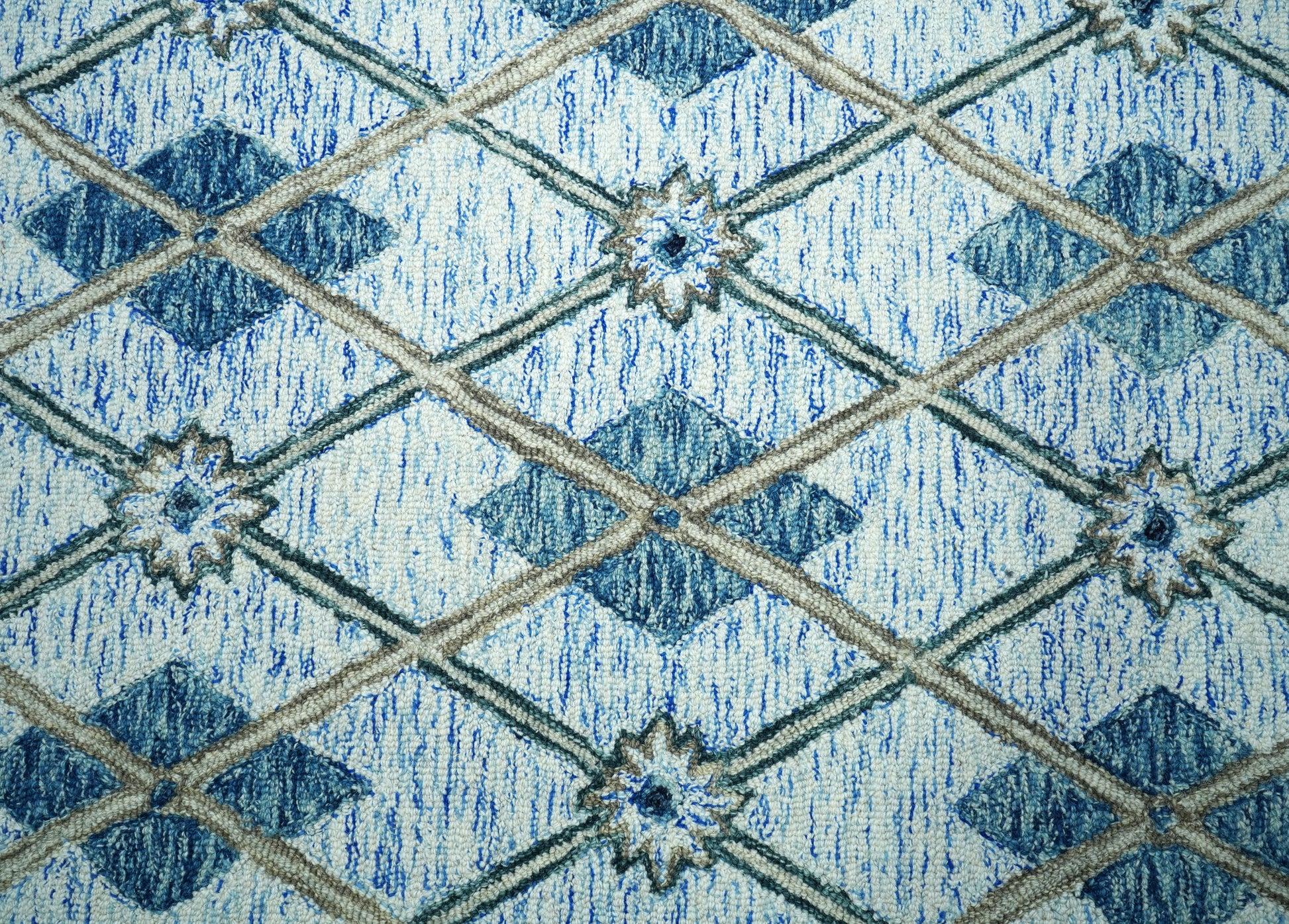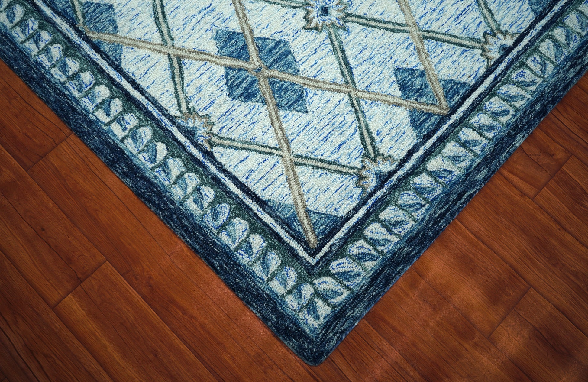 Teal Blue Ivory Diamond Lattice Floral Hand Tufted Wool Area Rug - Cut Pile Geometric Custom Sizes